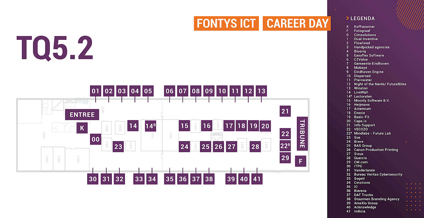 - Neem een kijkje op de bedrijvenmarkt. Er staan ca. 55 partners van Fontys ICT. De Career Day is een ideaal netwerkmoment voor jou om in gesprek te gaan met bedrijven over de mogelijkheden van een stage- of afstudeeropdracht of misschien wel een (bij)baan.